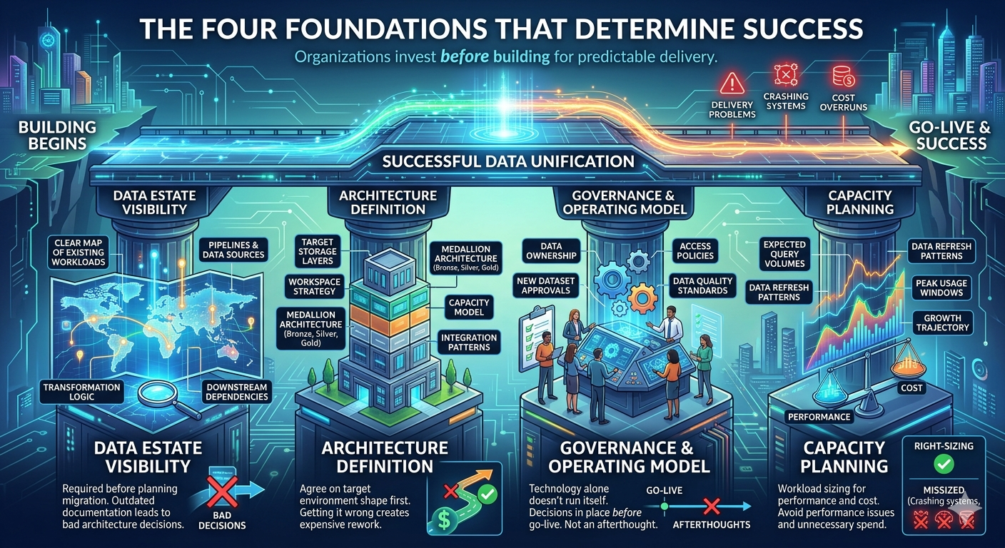 Organizations that execute well on data unification have consistently invested in four critical areas before they begin building. When any one of these is underdeveloped, it typically surfaces as a delivery problem later.